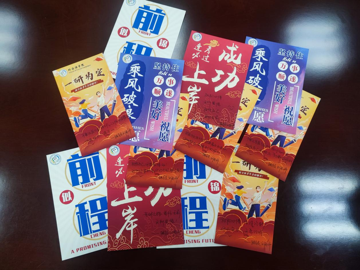 学院辅导员老师为2024届考研学生手写祝福,把暖心卡片送到学生身边,并与同学们亲切交谈,希望他们能调试最好的心理状态迎接考试。殷殷祝福语,浓浓关爱情。承载着学院师生的期愿,寄托着学院对考研学子们的亲切关怀和祝福。收到老师们精心准备的卡片,考研学子们倍感温馨、备受鼓舞,纷纷表示会全力以赴,给自己的考研之路交上一份理想的答卷。