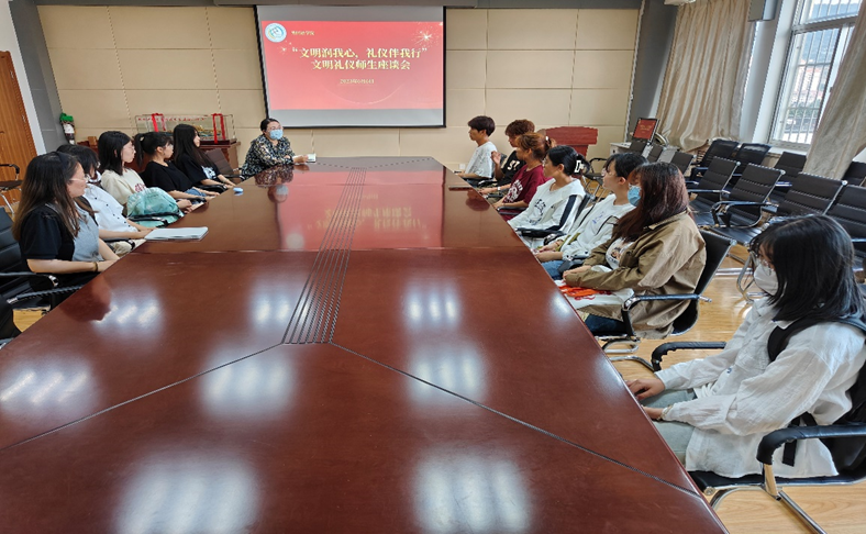 为推进外院学子精神文明程度的提高,培养学生良好的精神风貌,学院开展了文明礼仪师生座谈会,了解了学生在文明礼仪方面存在的问题,并对同学们提出了要求,希望同学们能严格要求自己,养成文明行为礼仪,从身边的小事做起,争做一名文明守纪的好学生。其中学生骨干尤其要做好表率,待人礼貌,交往和谐,语言文明,使同学之间和谐共处,有序生活。